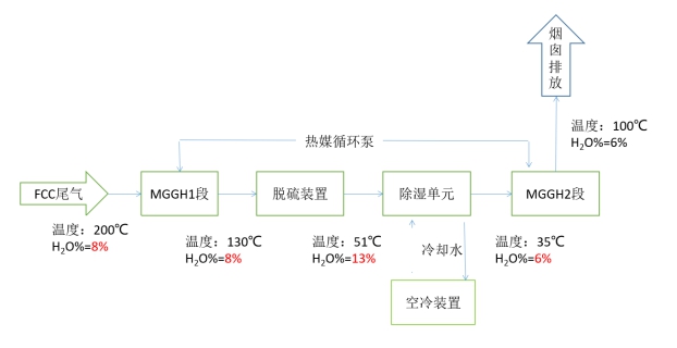 來自余熱鍋爐的煙氣(約200℃)先進入MGGH 1段,煙氣降溫至130℃,并加熱MGGH 1段內的熱媒;