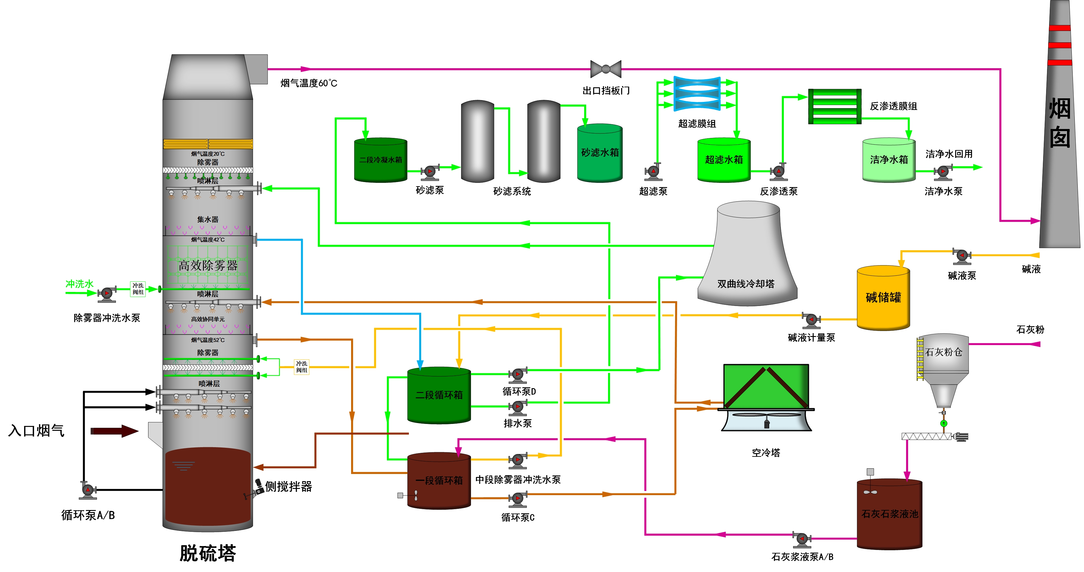 經(jīng)過SCR脫硝、布袋除塵、濕法脫硫初步凈化后的煙氣進(jìn)入深度冷凝節(jié)水(MHDV)系統(tǒng),首先通過高效脫硫除塵系統(tǒng)實(shí)現(xiàn)二氧化硫與粉塵的超低排放,再通過分段冷凝,實(shí)現(xiàn)煙氣深度冷凝節(jié)水。