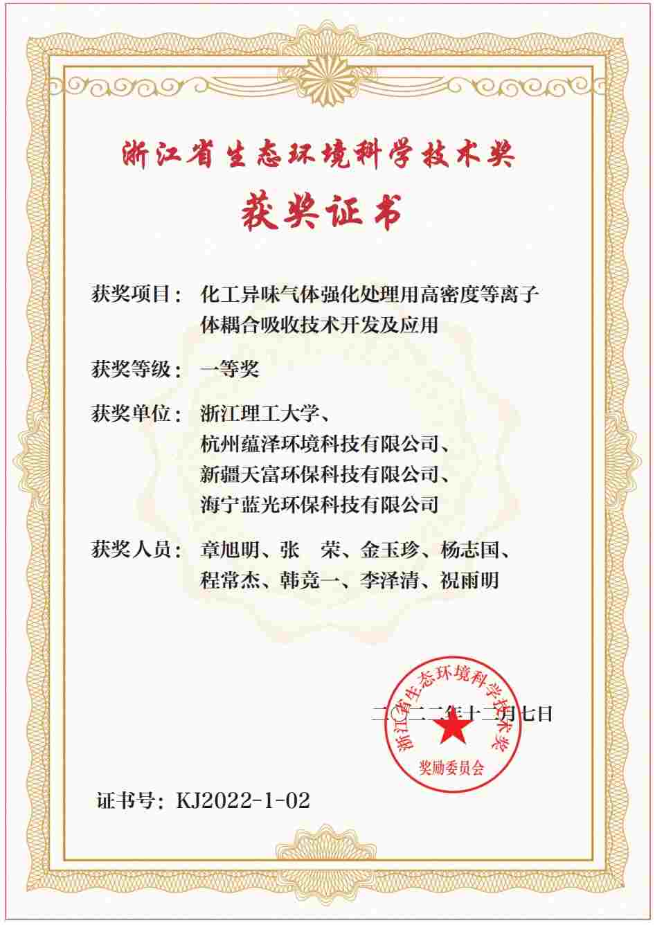2022年12月7日,根據(jù)浙江省環(huán)境科學(xué)學(xué)會(huì)《關(guān)于開展2022年浙江省生態(tài)環(huán)境科學(xué)技術(shù)獎(jiǎng)申報(bào)工作的通知》和《浙江省 生態(tài)環(huán)境科學(xué)技術(shù)獎(jiǎng)勵(lì)辦法(試行)》的通知,經(jīng)學(xué)會(huì)專家組形式審查、線上專家初審、現(xiàn)場(chǎng)終審答辯、網(wǎng)上公示,杭州蘊(yùn)澤環(huán)境科技有限公司聯(lián)合浙江理工大學(xué)等單位共同研發(fā)的“化工異味氣體強(qiáng)化處理用高密度等離子體耦合吸收技術(shù)” 獲得了浙江省環(huán)境科學(xué)學(xué)會(huì)專家組的高度評(píng)價(jià)與認(rèn)可,榮獲浙江省生態(tài)環(huán)境科學(xué)技術(shù)獎(jiǎng)一等獎(jiǎng)。這是學(xué)會(huì)對(duì)我司技術(shù)創(chuàng)新、推廣應(yīng)用工作的鼓勵(lì)、支持與信任。